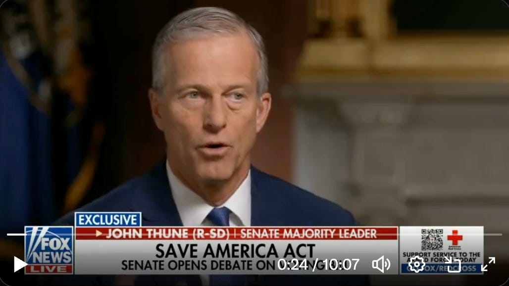 In that Fox News interview, Thune admits the SAVE Act is about making Democrats look bad. He wants videos of them opposing photo ID to vote, or citizenship proof to register, for campaign ads. Thune also doesn’t want to use the ‘talking’ filibuster to pass the bill, which would require senators to actually stand and debate (rather than threaten to do it). This would allow Democrats to propose unrelated amendments to the bill around Iran and Epstein. Republicans would have to take tough votes where they would look bad.